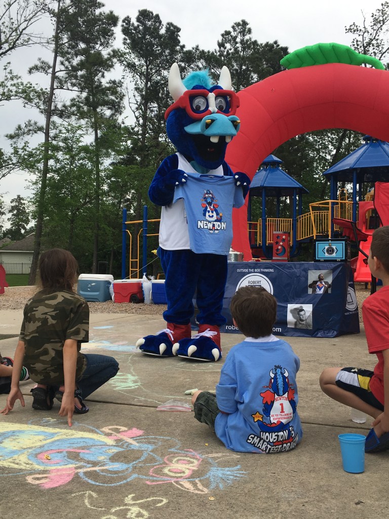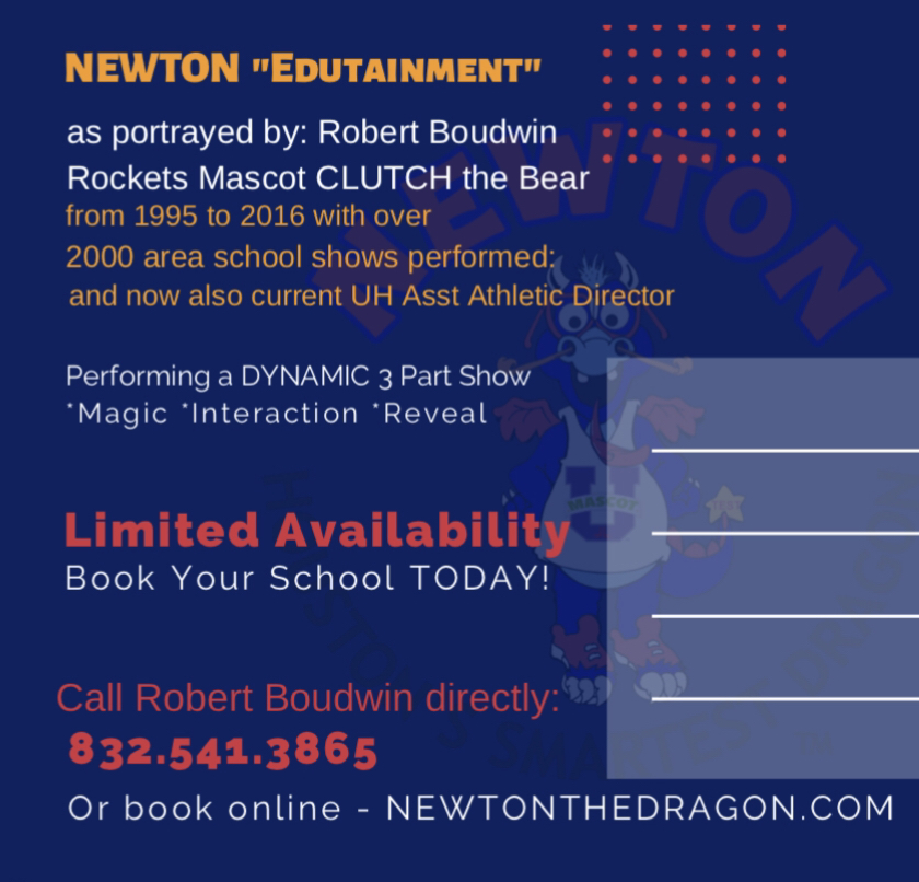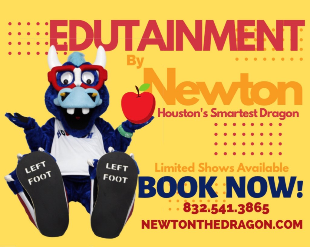 NEWTON THE DRAGON is a clumsy, zany bookworm, who magically inspires Houston area youth to a brighter future through imagination and education. Newton mystically conjures up and awakens both creativity & a love for facts and figures. He is the perfect left-brain right-brain one-two punch! 27 year veteran mascot performer Robert Boudwin has created & is solely portraying this character after 21 years of performing in front of 1.2 million Houston students spanning his career as Houston Rockets’ mascot, Clutch the Bear, a character he also created in 1995. Brand new show with all new surprises re-writing the rules of mascoting, but with the same unique brand of EDUTAINMENT you know and love! SHHHH…NEWTON TALKS & Robert also addresses the students as himself with an inspirational story of dreaming big and working hard.